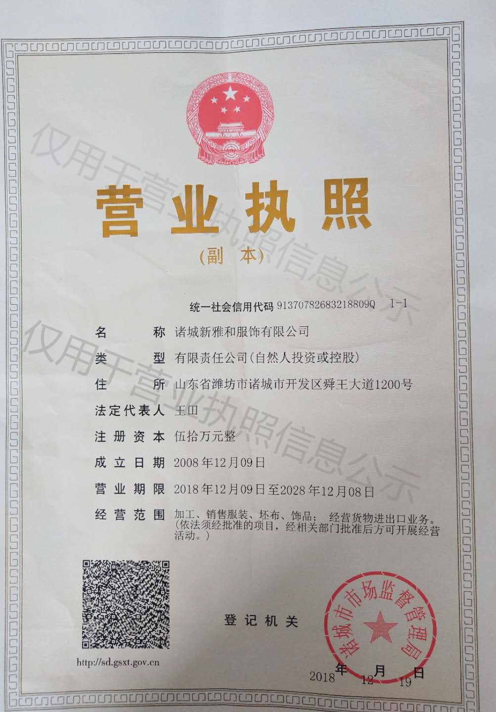 諸城新雅和服飾有限公司是一家擁有自營進(jìn)出口權(quán)、集貿(mào)工一體的現(xiàn)代化針織服裝加工出口企業(yè)。公司座落在諸城開發(fā)區(qū)橫四路北206國道以東。公司現(xiàn)有現(xiàn)代化日本進(jìn)口電腦縫制設(shè)備200多臺套,職工300人,年出口創(chuàng)匯1000萬美元。公司擁有一個團(tuán)結(jié)務(wù)實、業(yè)務(wù)嫻熟、反應(yīng)迅速、年輕化、現(xiàn)代化的管理團(tuán)隊。